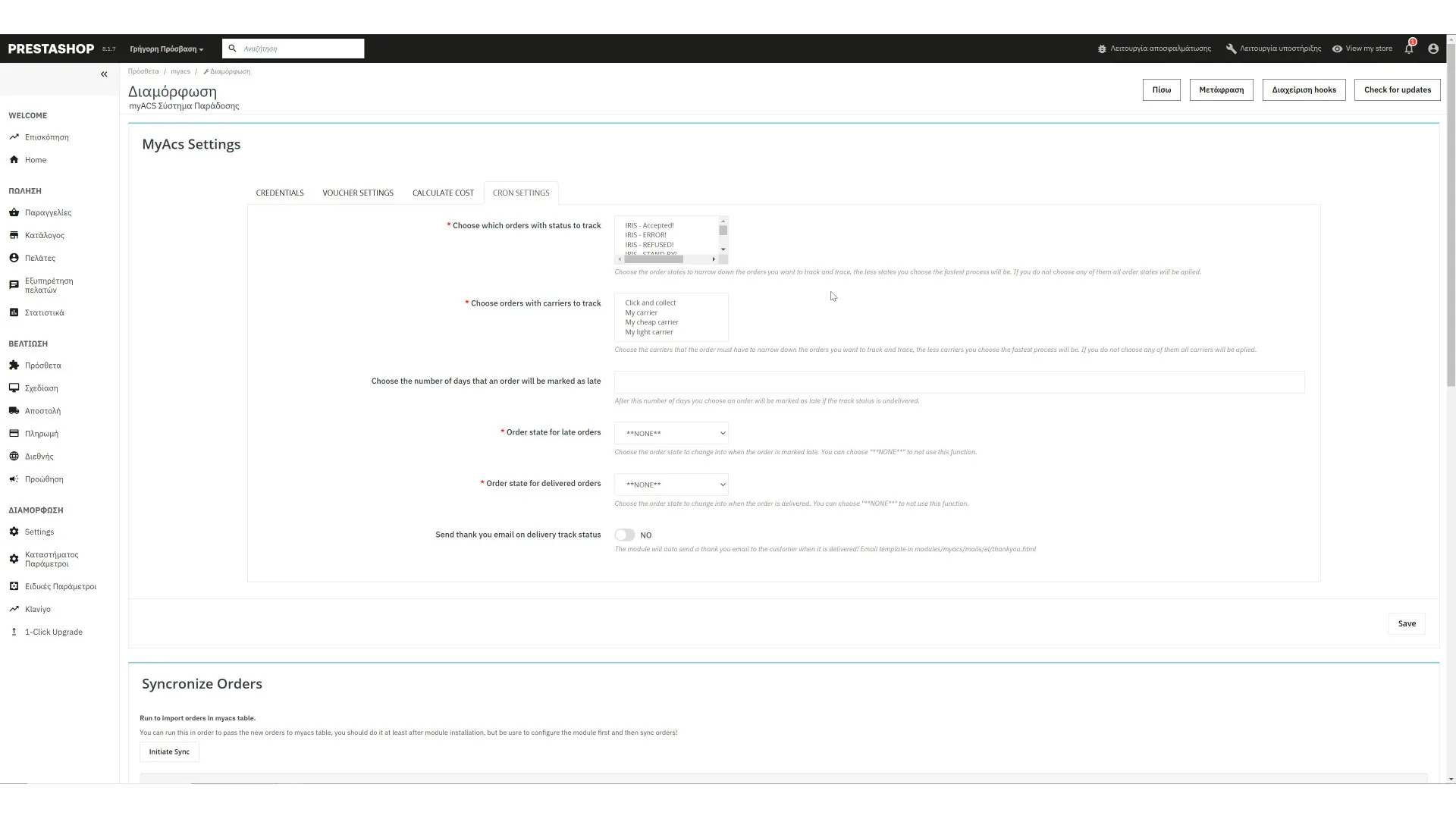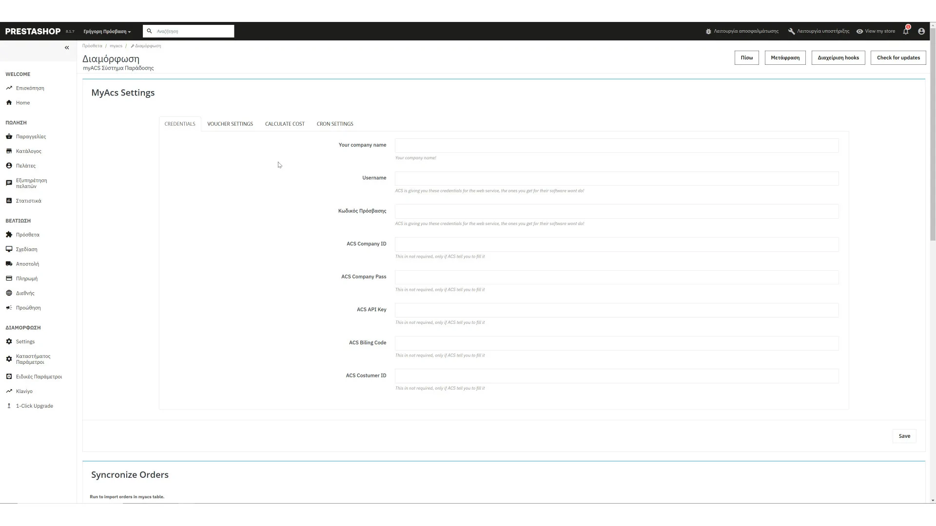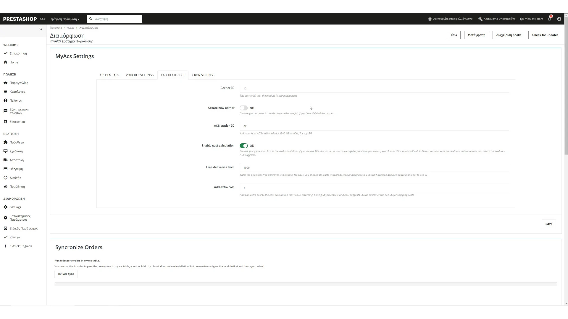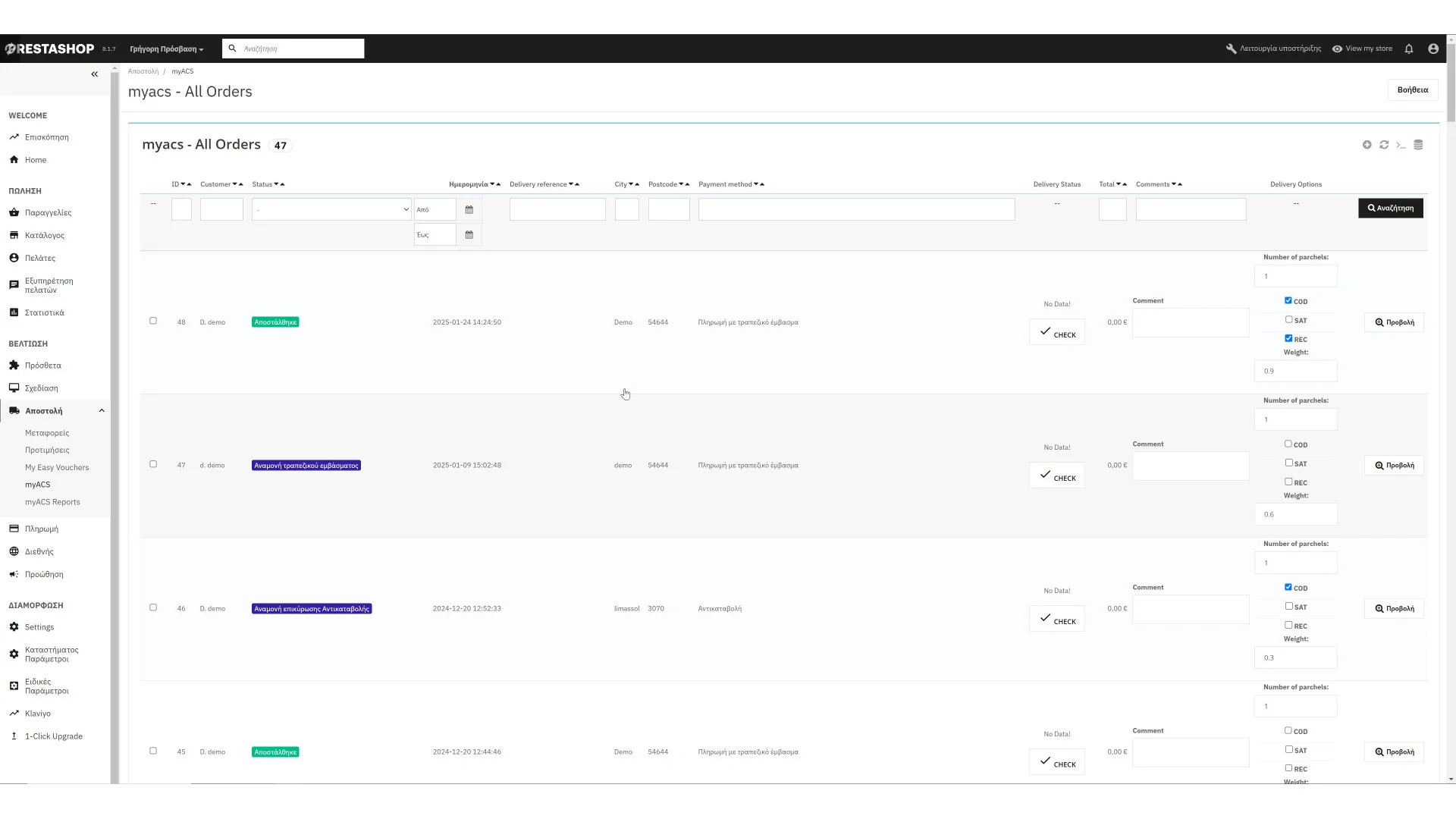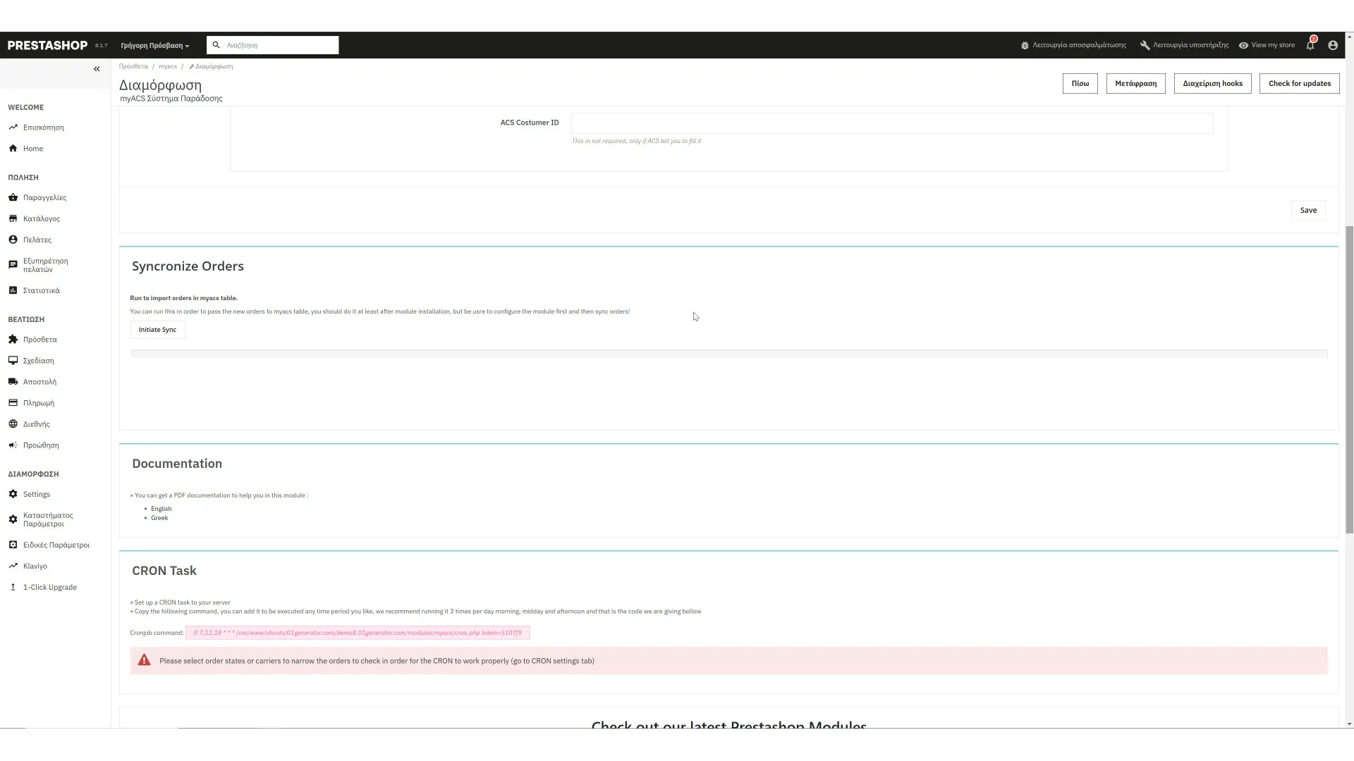 Το MyACS είναι ένα prestashop module αποστολής όπου επικοινωνεί με το API της ελληνικής εταιρείας ταχυμεταφορών ACS. Τώρα με αυτό μπορείτε να εκτυπώνετε και να παρακολουθείτε όλα τα πακέτα σας, καθώς και να ενημερώνετε τον πελάτη σας με τον αριθμό αποστολής. Επιπλέον, μπορείτε να προσθέσετε υπολογισμό κόστους.