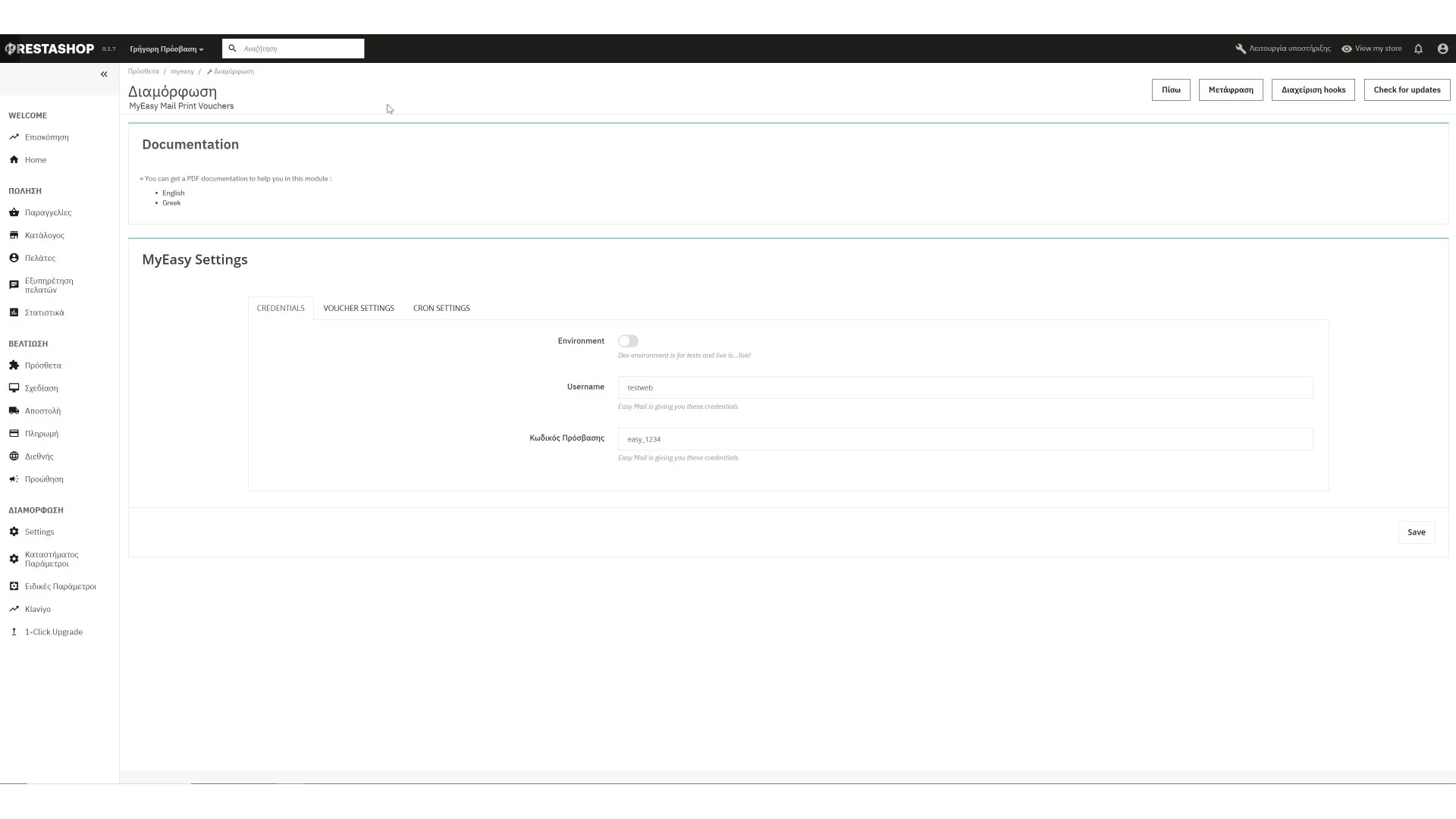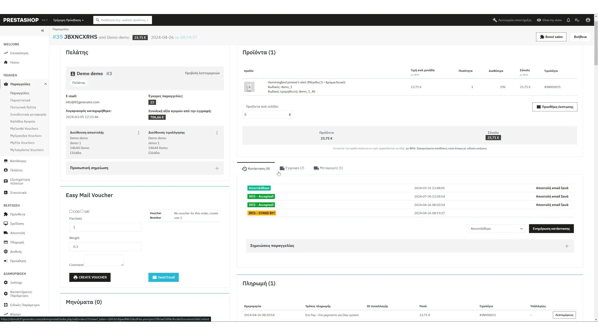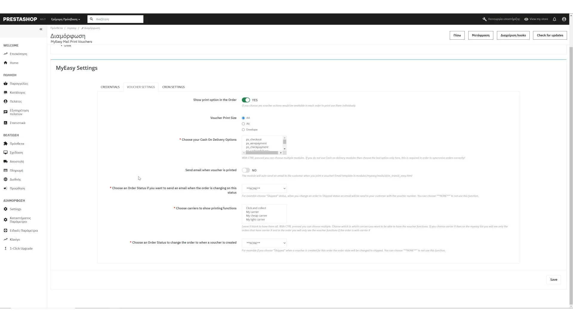 Πρόσθετο όπου επικοινωνεί με το web service της Easy Mail και εκτυπώνει voucher από το διαχειριστικό του PrestaShop σας. Ενημερώνει τον πελάτη σας με τον voucher μέσω email. CRON λειτουργίες σας επιτρέπουν να ελέγχετε τις παραγγελίες σας.
