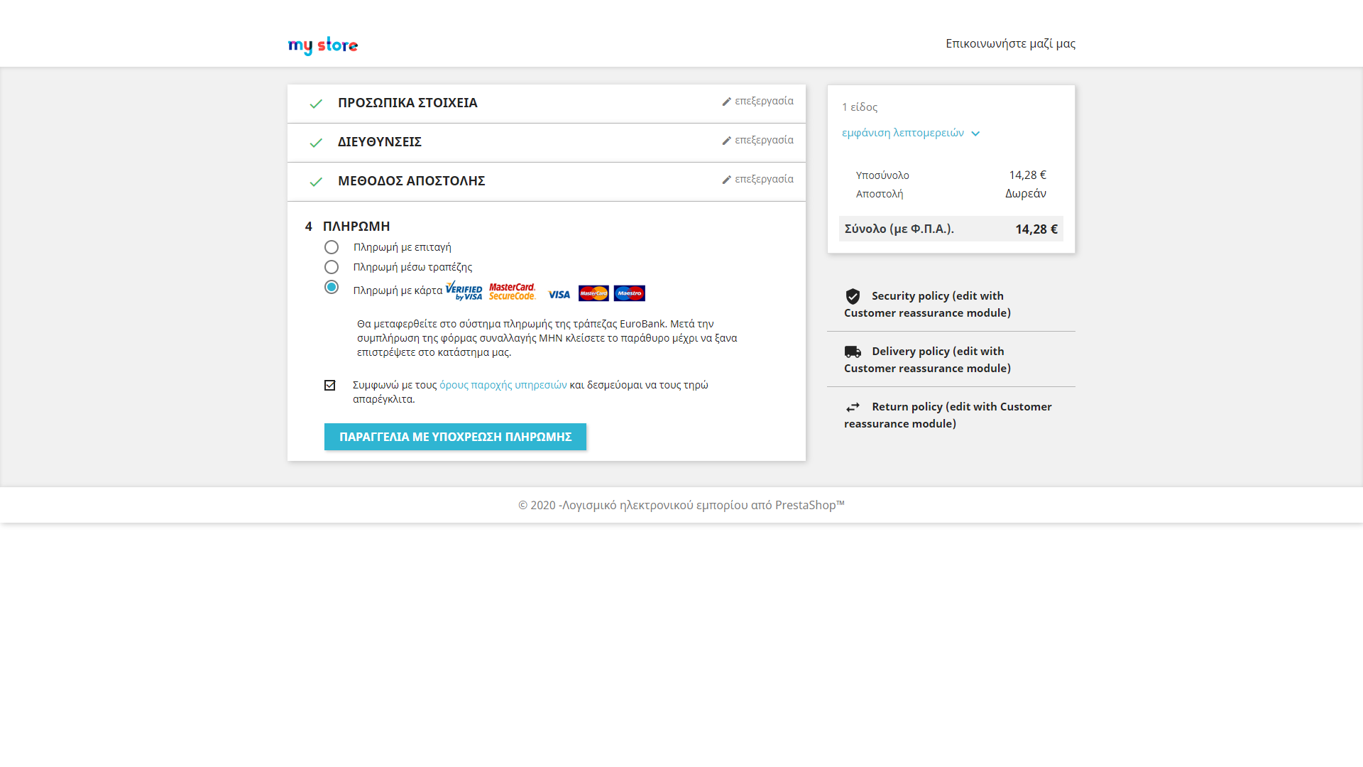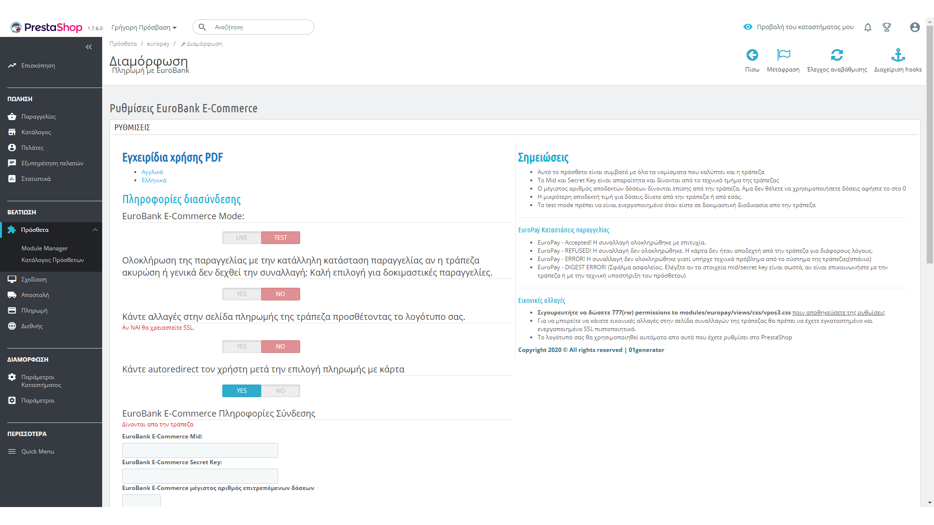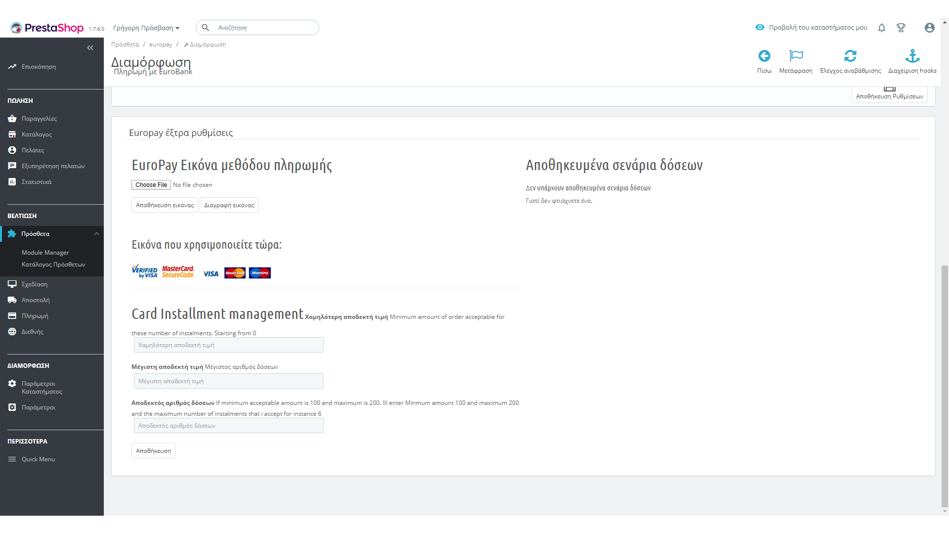 Το europay PrestaShop module addon. Επικοινωνεί με το σύστημα online πληρωμών της Τράπεζας EuroBank, δέχεται πληρωμές με κάρτα απο Visa, Visa Electron, Maestro κλπ. Επίσης παρέχει λειτουργεία δόσεων.