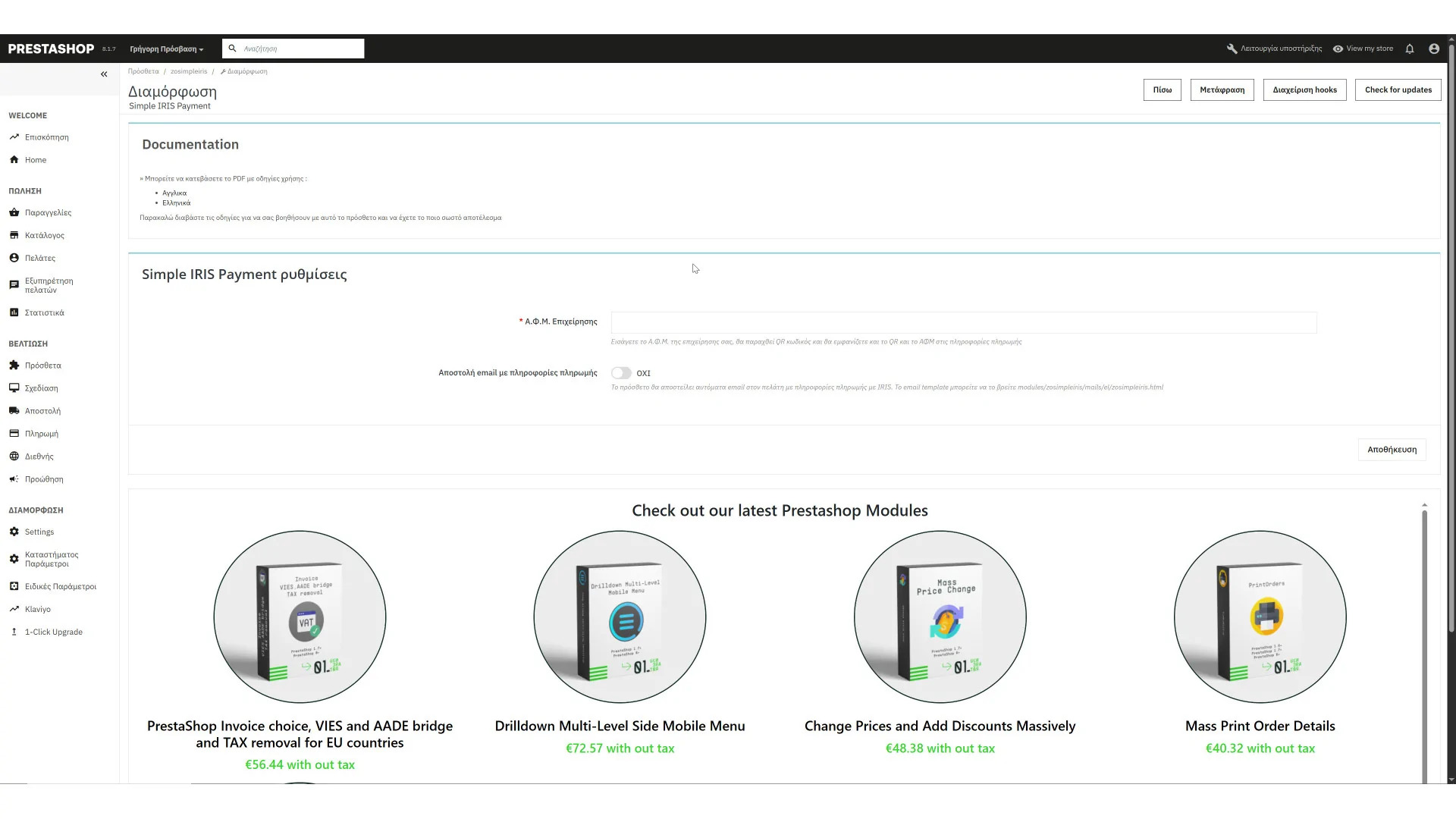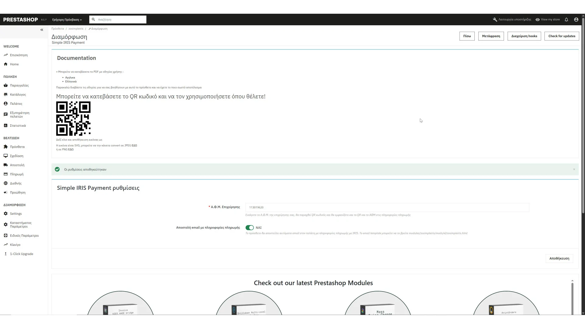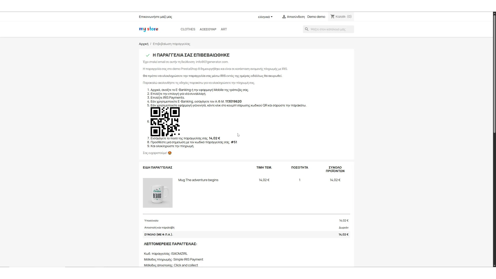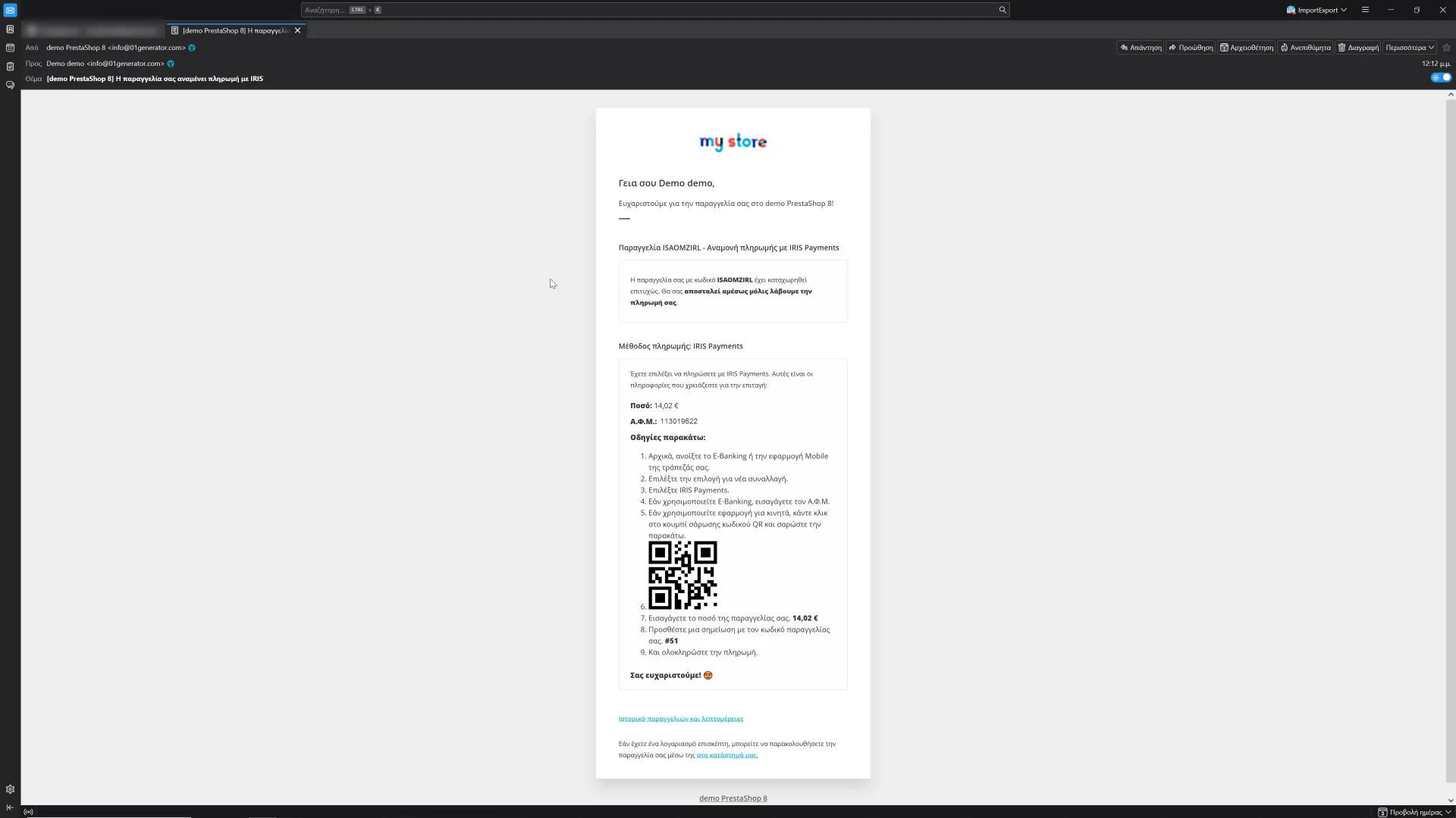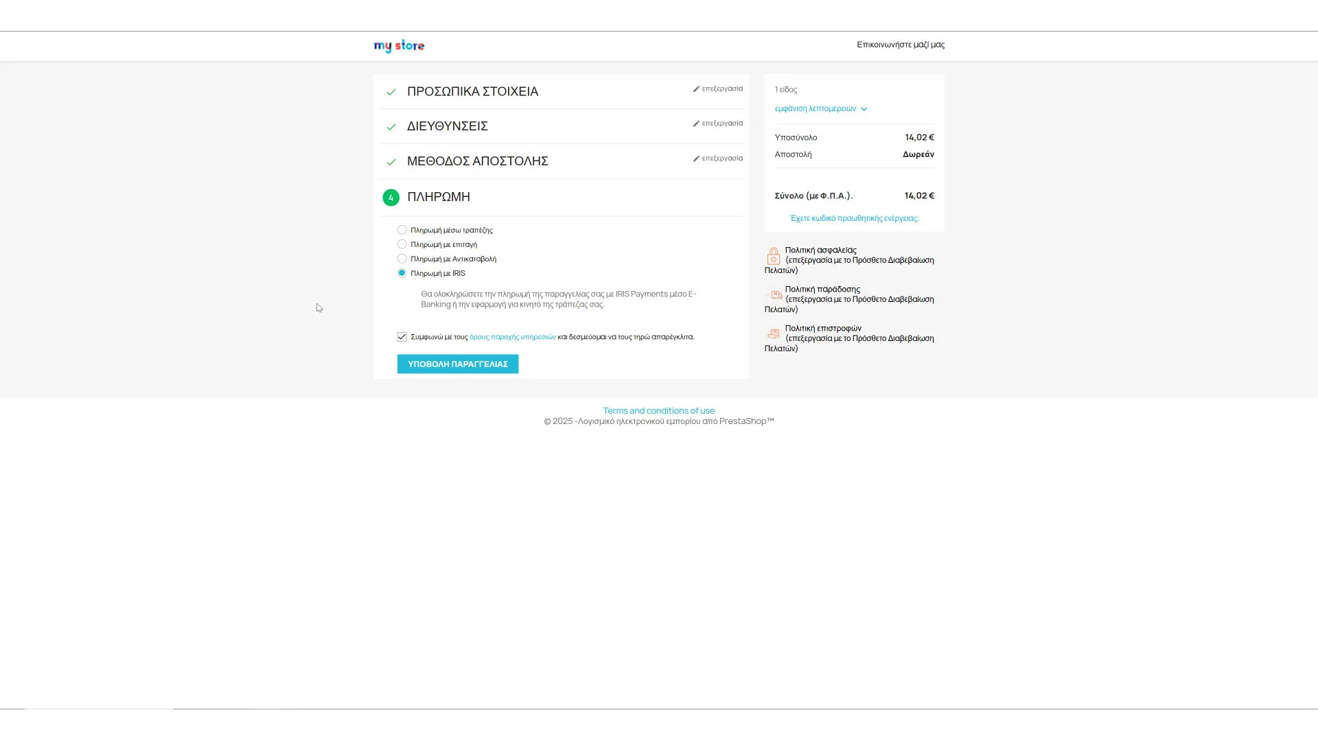 SimpleIRIS προσφέρει στους πελάτες σας τη δυνατότητα πληρωμής με IRIS Payments. Πρόκειται για μια πληρωμή εκτός σύνδεσης, που σημαίνει ότι δεν χρειάζεστε εξωτερική υπηρεσία. Η παραγγελία ολοκληρώνετε, ο πελάτης παραλαμβάνει οδηγίες και ολοκληρώνει την πληρωμή του από την εφαρμογή της τράπεζας του ή το E-Banking